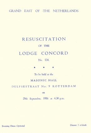 Pe 29 septembrie 1956, la ora 16:30, Marele Maestru al Olandei, Marii Prim și Al Doilea Supraveghetori, Secretarul, Trezorierul și Maestrul de Ceremonii au participat la ceremonia de redeschidere. De la UGLE au venit Asistentul Marelui Capelan și doi Mari Ofițeri din Trecut, în timp ce ceilalți patru Ofițeri de instalare reconsacrau Loja Corcord. Au fost prezenți 24 de Ofițeri și membri (din 26) și 75 de vizitatori (32 de nume sunt pe foi volante, și un anume frate J. Foreman din Loja Avondale nr. 2395. Clădirea putea găzdui 100 de persoane.
