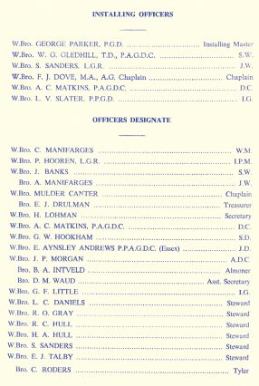 Ceremonia a decurs fără probleme, Venerabilul Frate C. Manifarges depunând jurământul și fiind instalat corespunzător într‑o scurtă ținută restrânsă; el l‑a investit ca M.Ven din Trecutul Imediat pe Venerabilul P.J. Hooren. A urmat strigarea și votarea candidatului pentru următoarea ținută (era din Essex), numirea și învestirea ofițerilor, definirea culorii Lojii, o dispoziție pentru redactarea regulamentelor, (fără Trunchiul Văduvei?), anunțurile și închiderea. Probabil că au terminat în jurul orei 18:00.